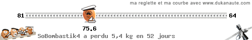 puis phase de croisière de puis le 8 janvier... j'ai l'impression que les kilo ne partent pas aussi vite qu'à ma première tentative...donc un peu dégoutée...après j' ai eu ma session règle du mois ... ça a peut être ralenti le processus... j'attend de voir la suite !