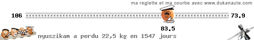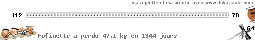 au fait - 500g ce matin! \o/ Bon je sais que je vais yoyoter pendant qq jours, c'est toujours comme ça! Mais ça descend! Bientôt 20 kg! je suis super contente!