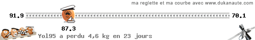 Posté le 13/08/2017 à 17:38 Bonsoir ton corps résiste ....3.4kgs en 12 jours c'est bien (la moyenne c'est 1kg par semaine) par contre les yaourts au chocolat interdits Ces yaourts type Taillefine chocolat ou Sveltesse caramel, etc. sont sortis de la liste des tolérés, contenant trop de glucides En savoir plus sur http://www.proteinaute.com/fiche_dukan/taillefine_0_9-125.html#7Xu3gFwgfp5xO0BM.99 et pourquoi arreter la galette du matin ??? au contraire c'est très bien de consommer les sons le matin çà permet de tenir sans avoir faim bonne continuation